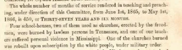 The hindrances listed had much to do with the ongoing discrimination and racial prejudices that characterized the Reconstruction Era, as well as the reality that the formerly enslaved were now “without certain homes, and must, of necessity, be drifted about for some time to come” and that “their poverty prevents their doing much for their churches or schools.” The missionaries and those being taught and assisted faced heightened hostility from the folks around them, saw a number of school houses go up in flames, and were ostracized and alienated by their communities.